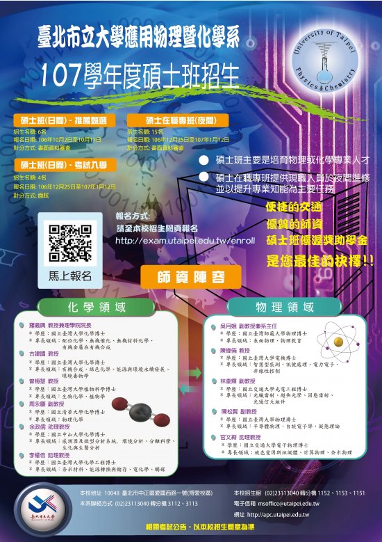 臺北市立大學應用物理暨化學系107學年度碩士班(日間)、碩士在職專班(夜間)招生海報