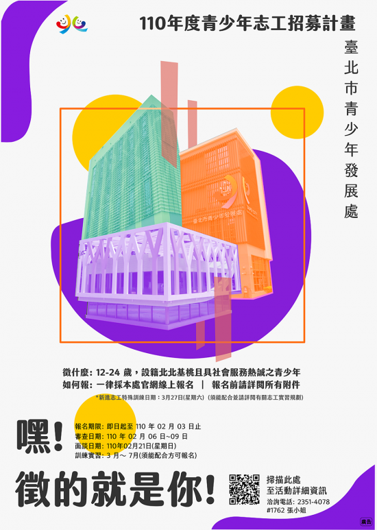 二、招募對象:12歲至24歲設籍臺北市或就讀臺北市、新北 市、基隆市、桃園市公私立國民中學以上各級學校(含自學 生)且具社會服務熱忱之青少年。