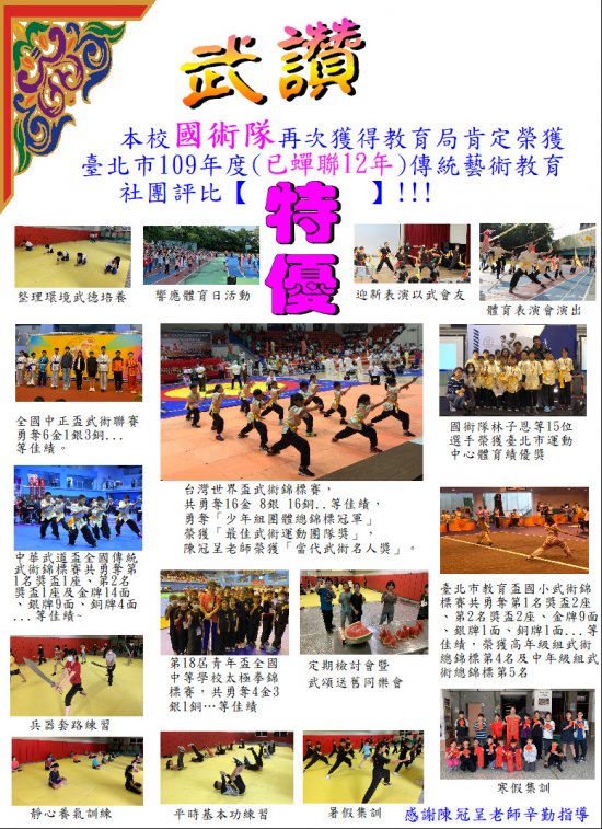 二、本校國術隊由國際級教練訓練,於各項賽事屢創佳績,尤其已蟬聯12年榮獲臺北市推展傳統藝術教育活動社團評比【特優】!歡迎貴校四升五年級有興趣的同學前來報考。