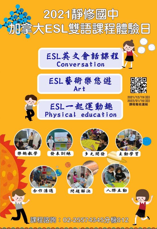 三、報名方式:請至靜修中學網頁(www.bish.tp.edu.tw)或掃 描附件文宣報名,升學諮詢請洽02-25574345轉302 潘組 長。