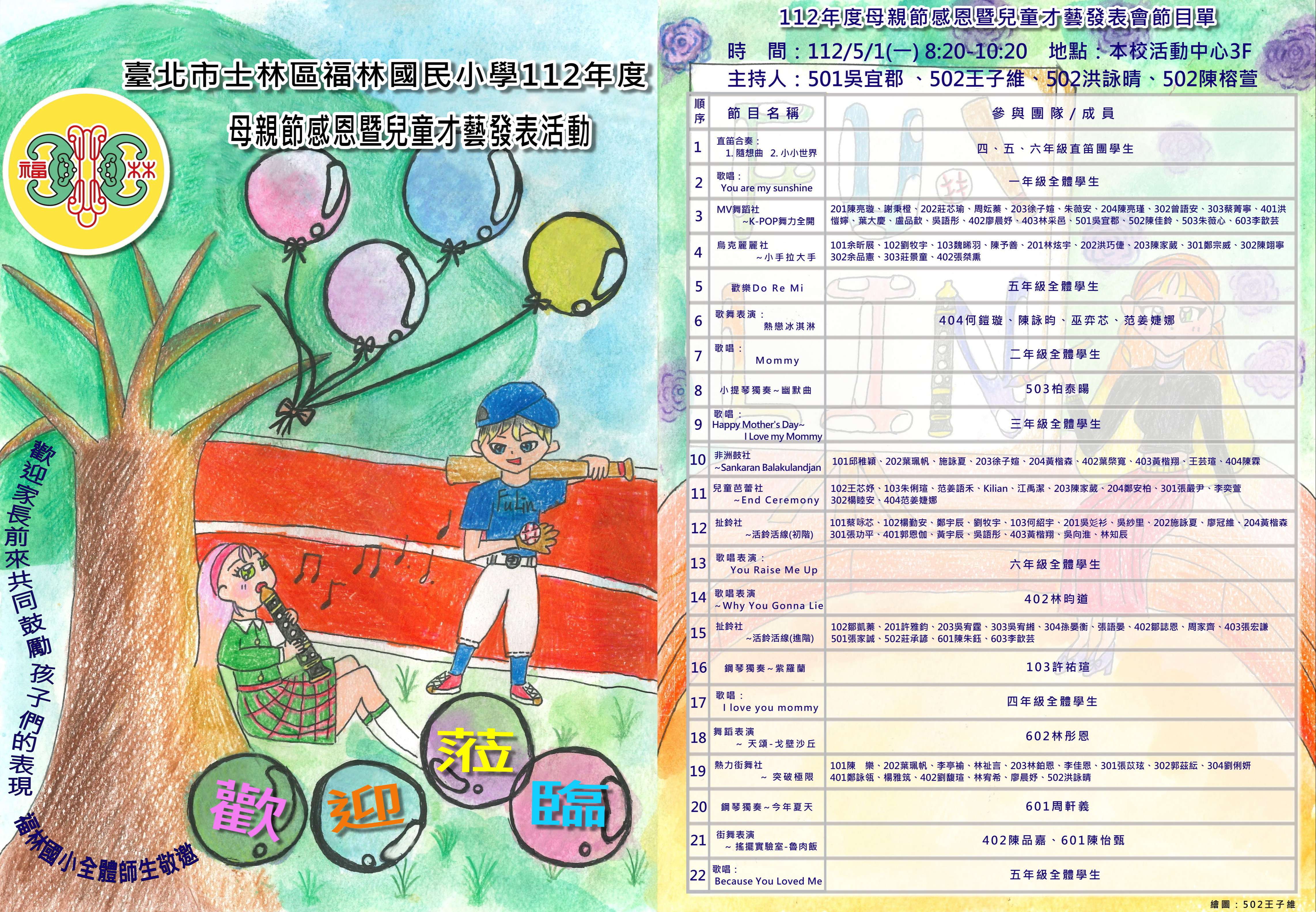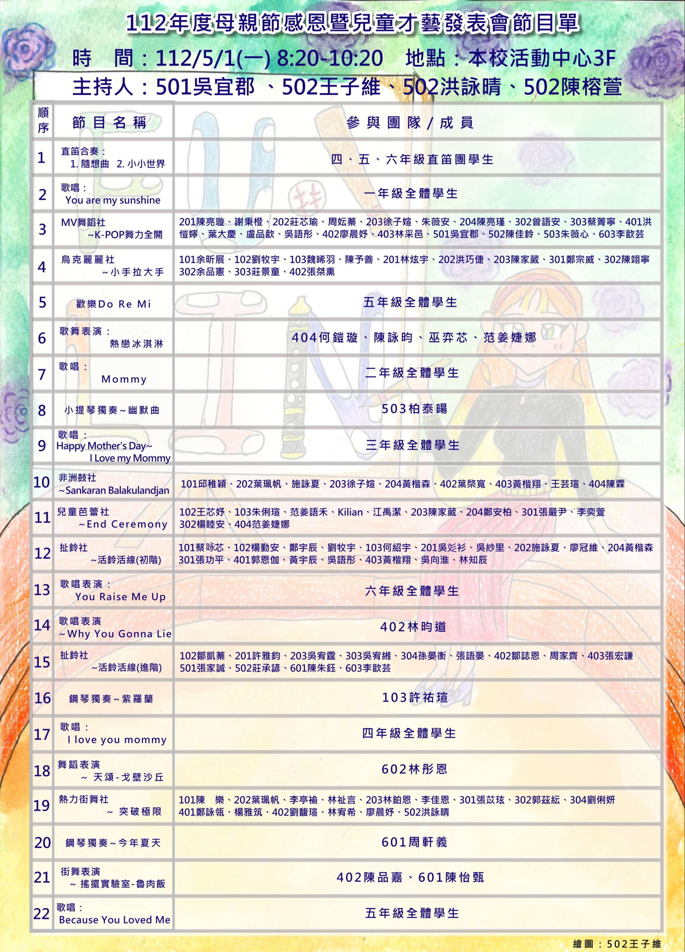 附檔是112年度母親節感恩暨兒童才藝發表活動的家長邀請卡,歡迎家長5/1(一)早上8:20前來觀賞孩子們的精彩演出!