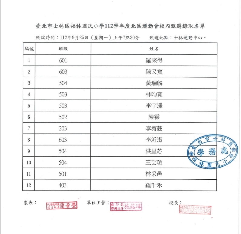 請以上錄取的學生於10 月 2 日(星期一)中午 12:30 至學務處體育組報到,由教練說明集訓注意事項