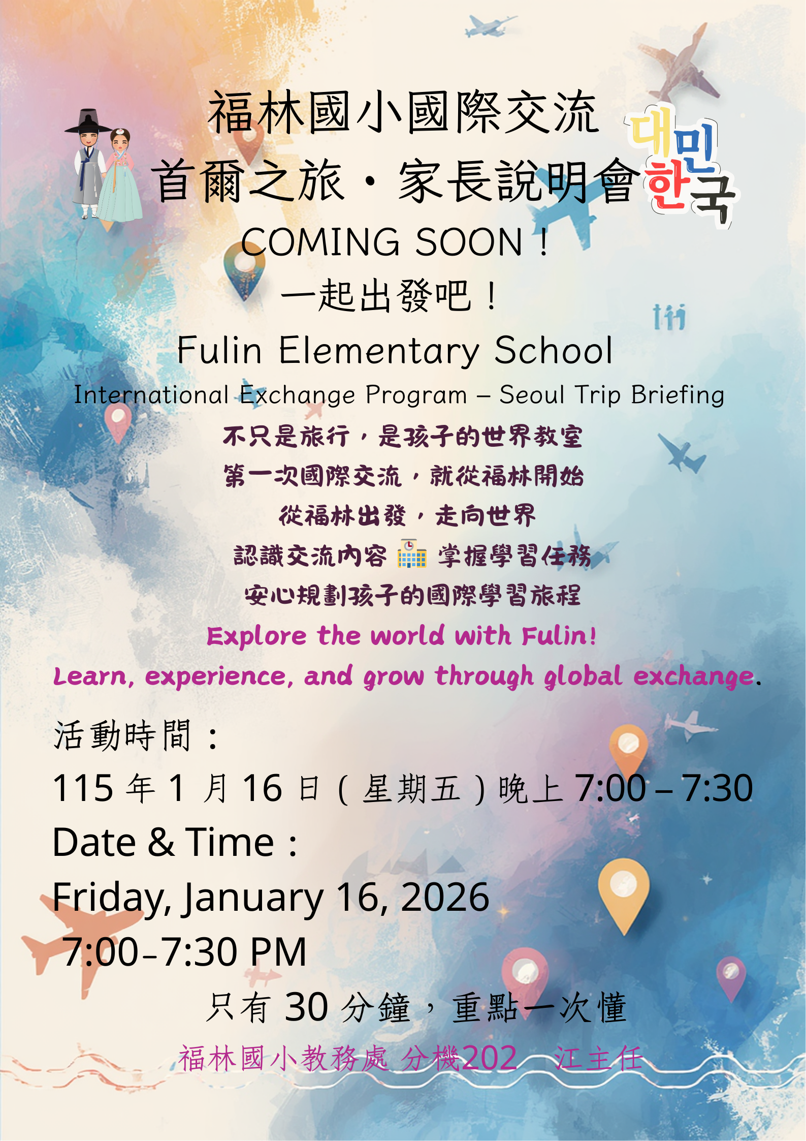 114學年度國際交流說明會將於1月16日晚上7:00-7:30舉辦。地點為活動中心總務處旁會議室。