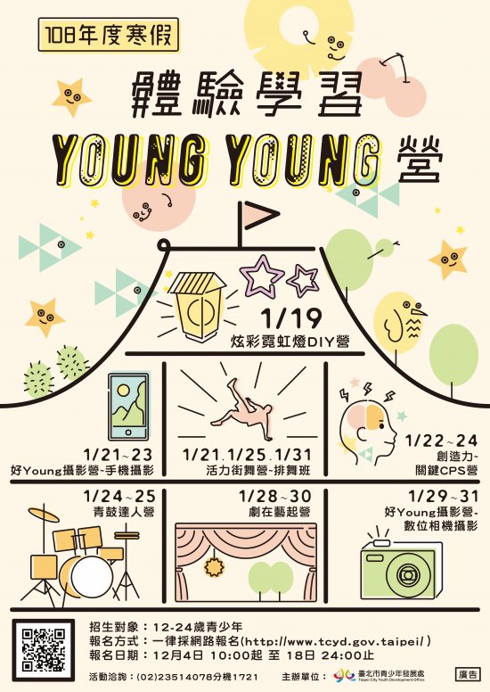 為鼓勵青少年於寒假期間參與正當休閒活動,特規劃辦理108年度寒假「我是創客」、「體驗學習Young Young營」系列活動,期藉由不同面向之體驗學習、探索發展,開發青少年多元潛能。