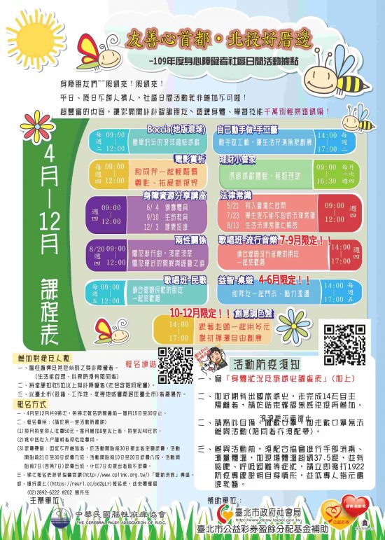 (三)、報名費用:(請於第一堂活動時繳納) 1、每月每堂每人收費50元,當月參加8堂以上者,每堂以 40元計。2、具中低收入戶證明者免收取費用。 3、退費機制:因故不克參加者,於活動開始前30日提出 者全額退費,活動開始前21日至30日退費九成,活動 開始前10日至20日退費八成,活動開始前7日(含第7 日)退費五成,少於7日內提出者則不退費。 4、填妥線上報名表,並於第一次上課繳交身心障礙手冊 影本。