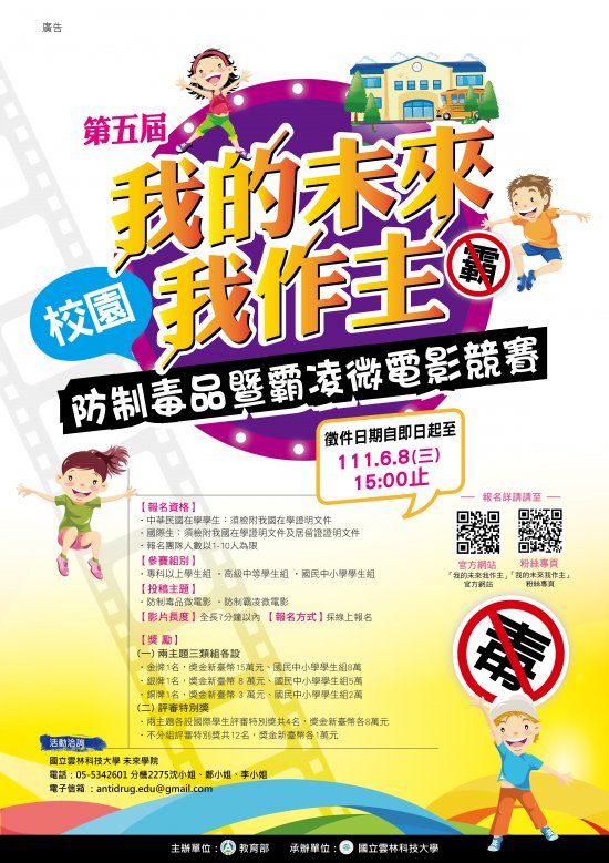 四、詳細競賽資訊請見「我 的未來我作主」官方網站(www.antidrug.tw/)、臉書粉絲專頁(www.facebook.com/antidrug.edu/),