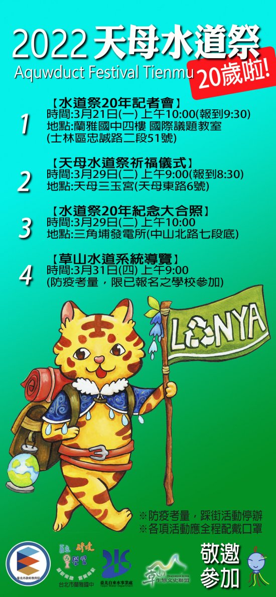 一、自2003年第1屆水道祭舉辦以來,今年邁向第20週年,2022天母水道祭將以再造地方文化、凝聚公民意識為主軸,透過活動讓學校與社區團體合作、分享並期盼喚醒大眾身體力行,展現實踐與愛護環境的行動力。