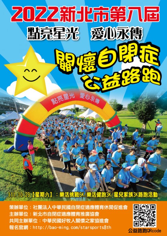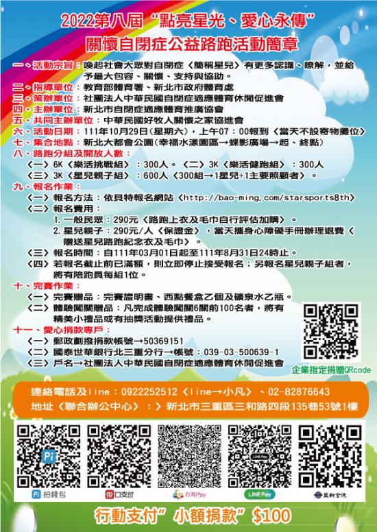 主旨:社團法人中華民國自閉症適應體育休閒促進會策劃辦理2022新北市第八屆「點亮星光、愛心永 傳」關懷自閉症公益路跑活動,簡章〈DM〉乙份,詳如附件 及說明。