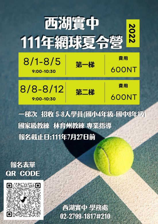 主旨:西湖國中111學年度暑期開辦網球夏令營活動。