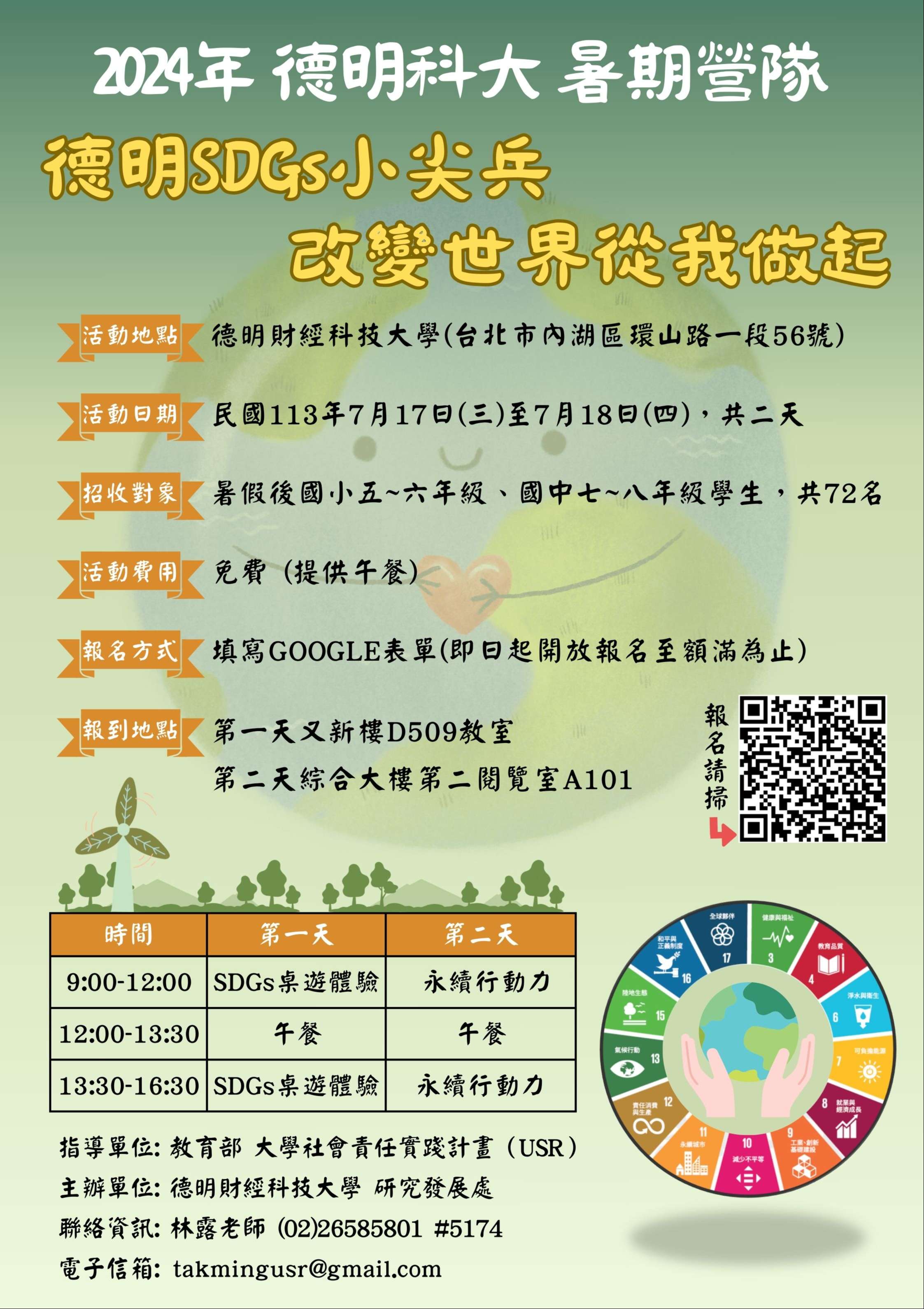 一、依據德明財經科技大學113年5月30日德研字第1130005594 號函辦理。 二、為執行教育部第三期(112-113年)大學社會責任(USR) 計畫,推動國中小生永續教育,期以輕鬆有趣的方式啟發 孩子們對永續發展目標(SDGs)的認識和行動,通過SDGs 桌上遊戲體驗與永續行動力啟發活動,激發學員在日常生 活中實踐SDGs目標,並成為永續行動的推動者。 三、活動相關資訊如下: (一)活動時間:113年7月17日(星期三)至7月18日(星期 四),共二天。 (二)招收對象及名額:暑假後國小五~六年級、國中七~八年級學生,共72名。 (三)活動地點:德明財經科技大學(臺北市內湖區環山路一 段56號)。 (四)活動費用:免費。 (五)報名方式:請填寫google表單報名https://reurl.cc /8vvpny (六)報名日期:即日起至額滿為止。錄取者於113年6月25日 (星期二)寄發email通知,未錄取者不另通知。 四、檢附營隊簡章及宣傳海報電子檔各1份,若有問題,請洽活 動聯絡人:林露老師,電話:02-26585801轉5174,電子信 箱:takmingusr@gmail.com。