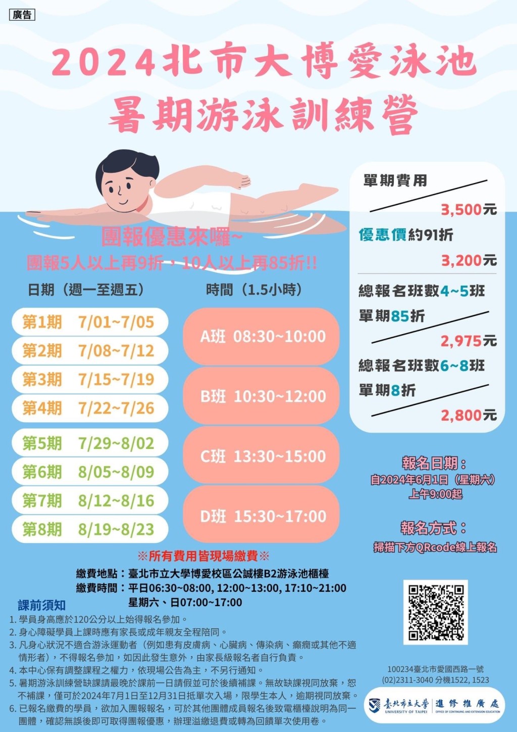 一、本校博愛校區泳訓班期間為113年7月1日至8月23日週間辦理,每期授課日為星期一至星期五共計5日,為期8期。每 期並再細分為上午2班次,下午2班次,每次授課90分鐘, 以提供完整時段及學習時間供學員選擇報名。