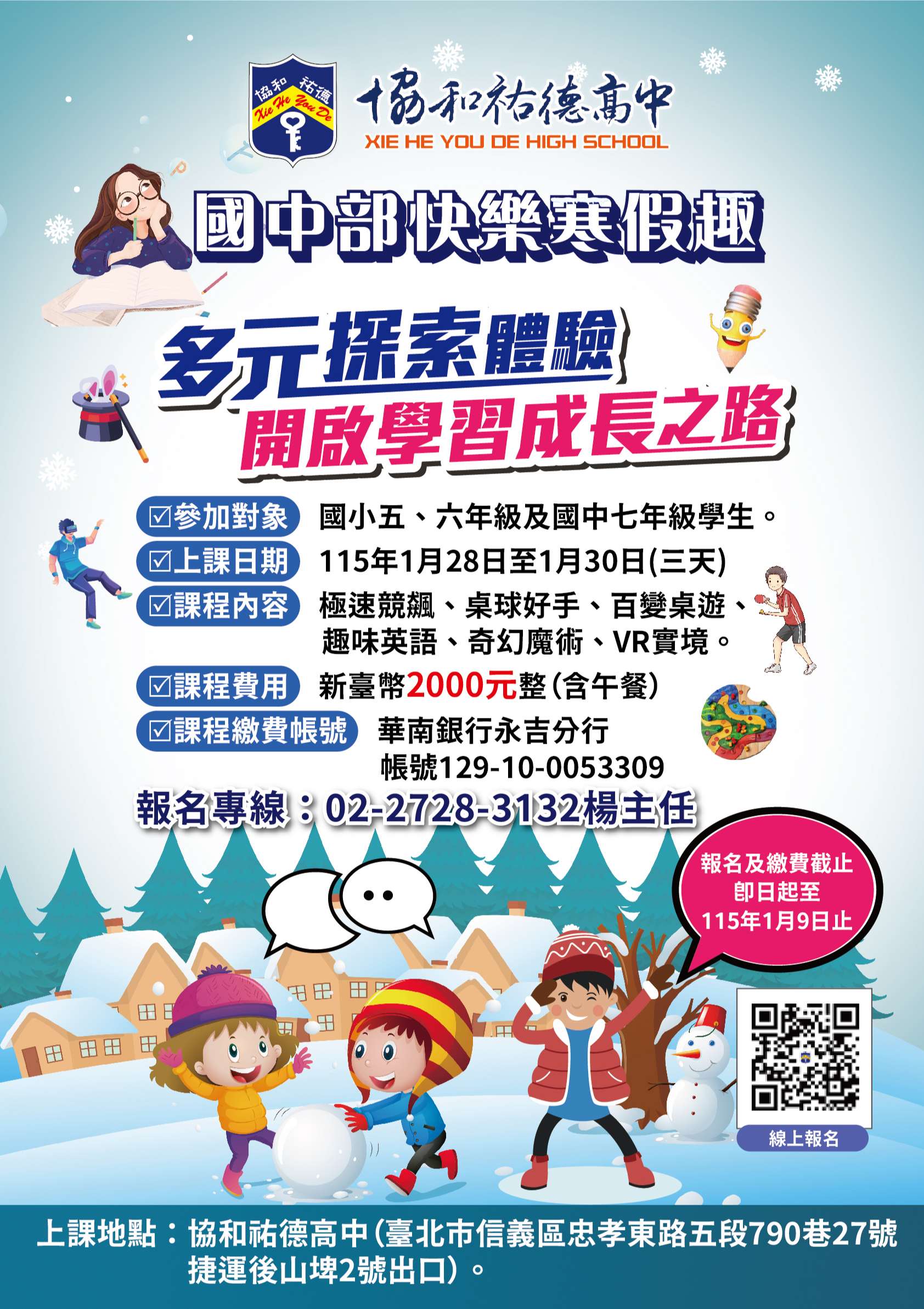 七、活動場地:臺北市協和祐德高中(臺北市信義區忠孝東路五 段790巷27號,捷運後山埤站2號出口)報名專線:(02)2728-3132 楊主任 八、實施計畫詳如附件。