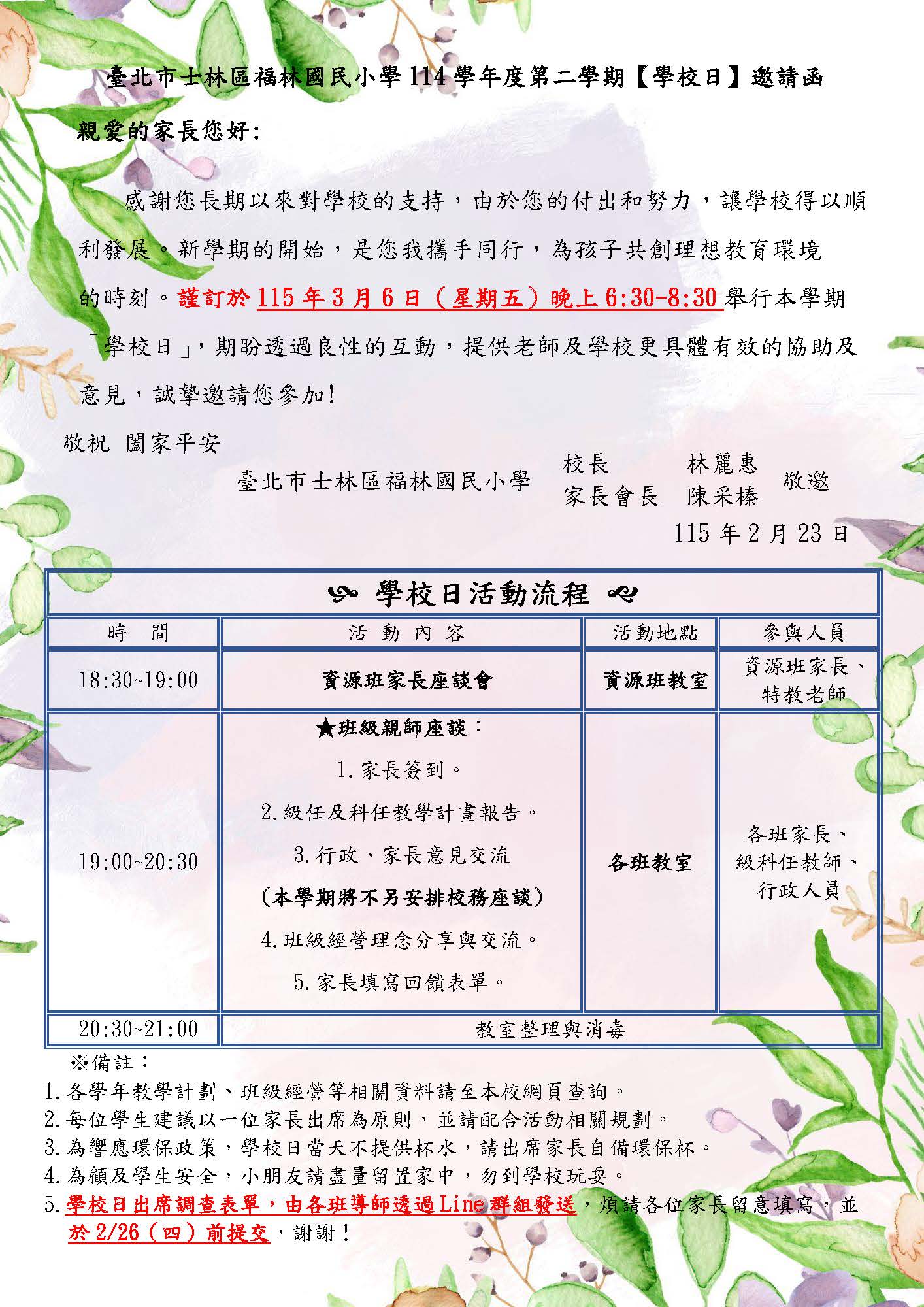 114學校日邀請函暨班級經營計畫