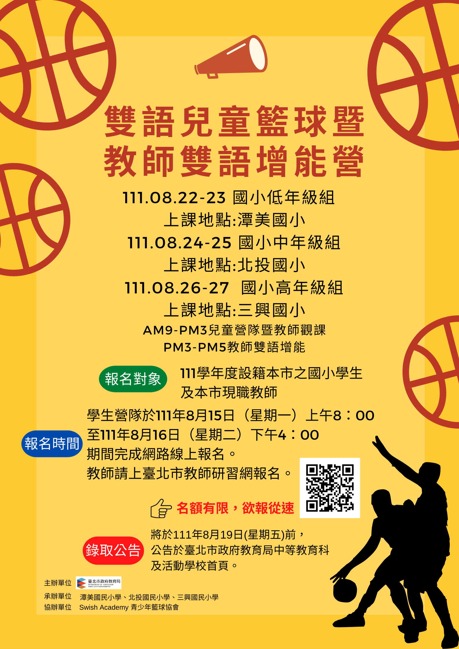(一)雙語籃球營 1、低年級組:8月22日(星期一)至8月23日(星期二)。 2、中年級組:8月24日(星期三)至8月25日(星期四)。 3、高年級組:8月26日(星期五)至8月27日(星期六)。