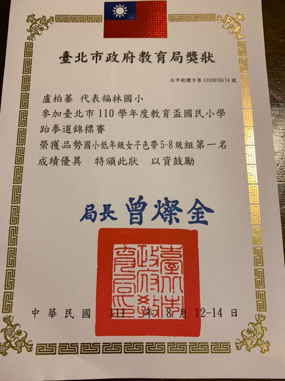 盧柏蓁 榮獲品勢國小低年級組女子色帶5-8級組 第一名
