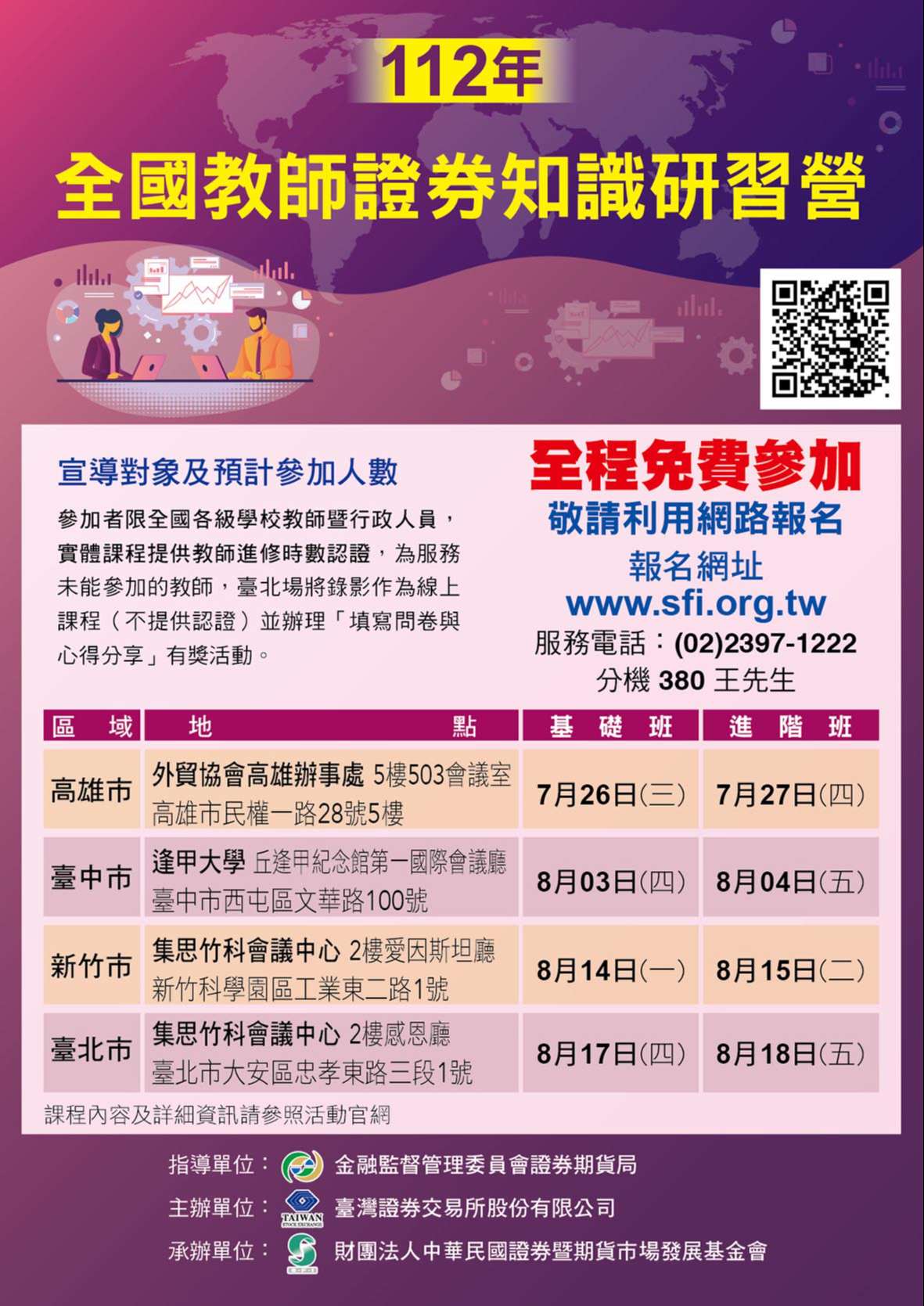 說明: 一、依據財團法人中華民國證券暨期貨市場發展基金會112年6 月28日證基(宣)字第11200006722號函辦理。 二、旨揭計畫活動為實體課程完全免費,教師參與本活動可獲 得「教師研習時數」認證,敬請協助自即日起至8月18日 止,於網站上建立連結以廣為周知,並鼓勵教師報名參 加,電子文宣如附件,連結網址為 https://webline.sfi. org.tw/workshop/Default.asp?csn=631 三、為服務未能參加的教師,基礎及進階課程將全程數位化實 況錄影置於「臺灣證券交易所Webpro3.0影音傳播網」(上 網搜尋Webpro3.0),並於9月1日至10月2日辦理「填寫問卷與心得分享」活動,歡迎教師及行政人員觀看、填寫問 卷及分享觀看心得,並可參加抽獎活動獲得超商禮券,詳 情請至本活動專區查詢。 四、倘有疑義,請洽承辦人王則喻,電話:02-23971222分機 380 。