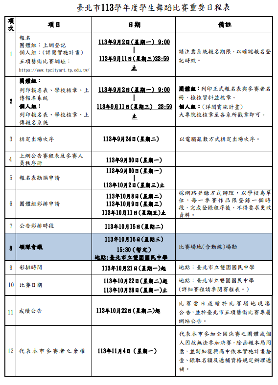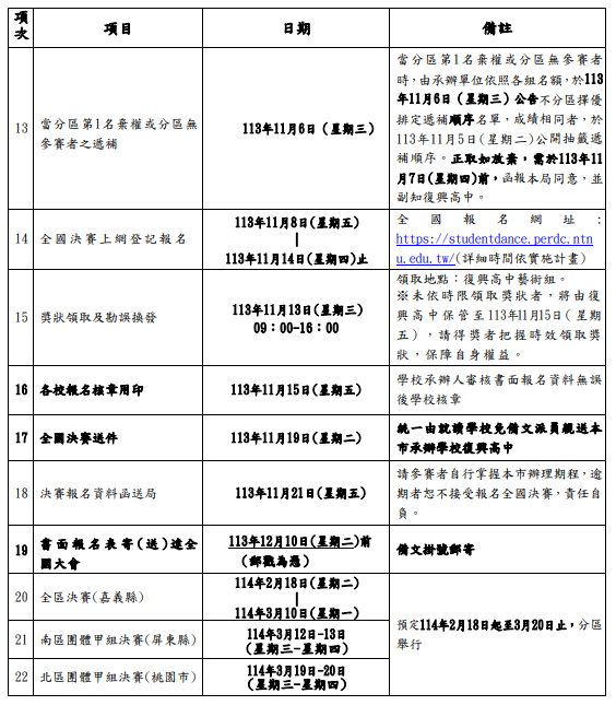 一、依據本局113年8月13日北市教特字第1133086039號函續 辦。 二、原附本市113學年度學生舞蹈比賽重要日程表第21、22項次 之南區團體甲組決賽(桃園市)、北區團體甲組決賽(屏 東縣),應修正為南區團體甲組決賽(屏東縣)、北區團 體甲組決賽(桃園市)。
