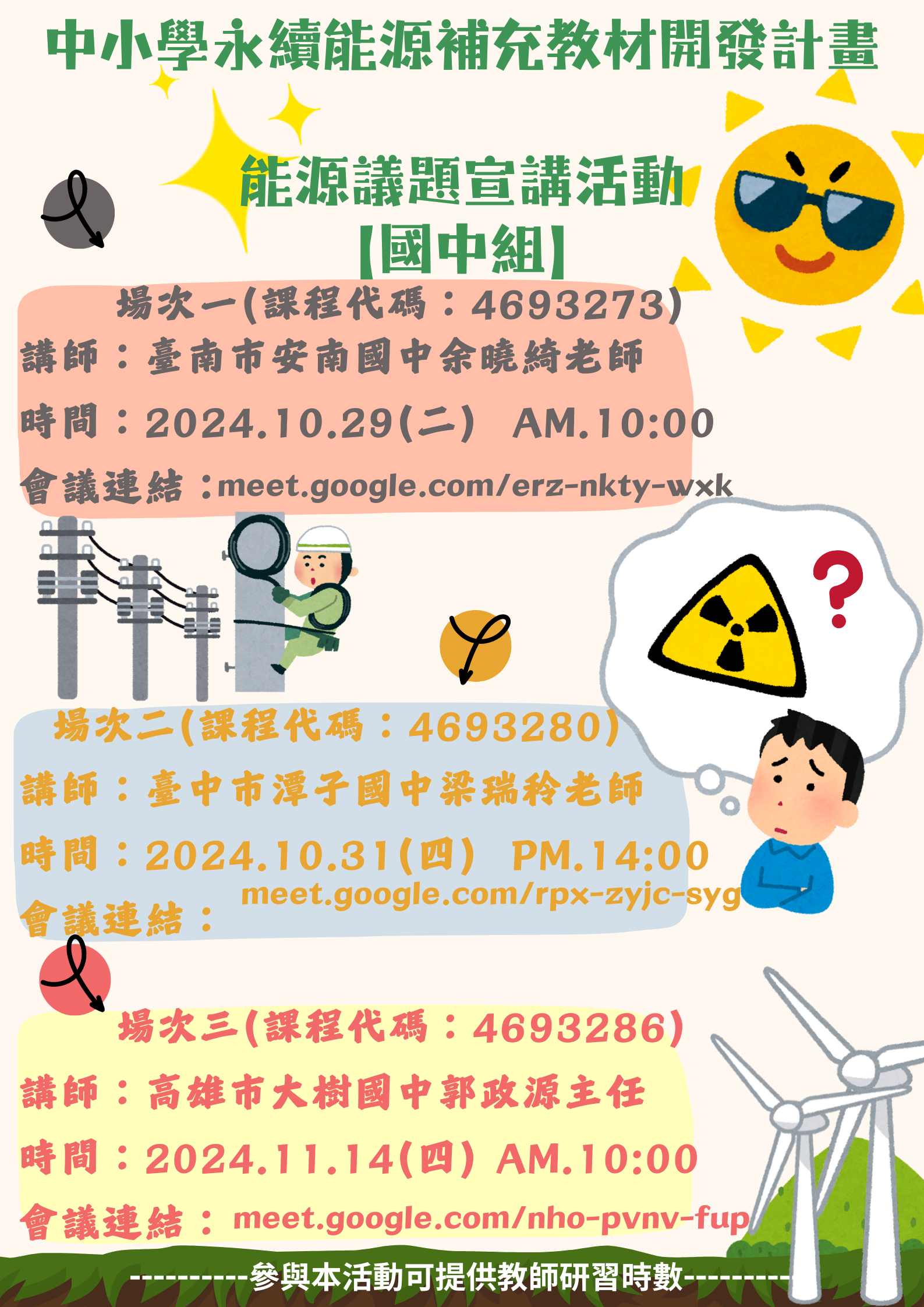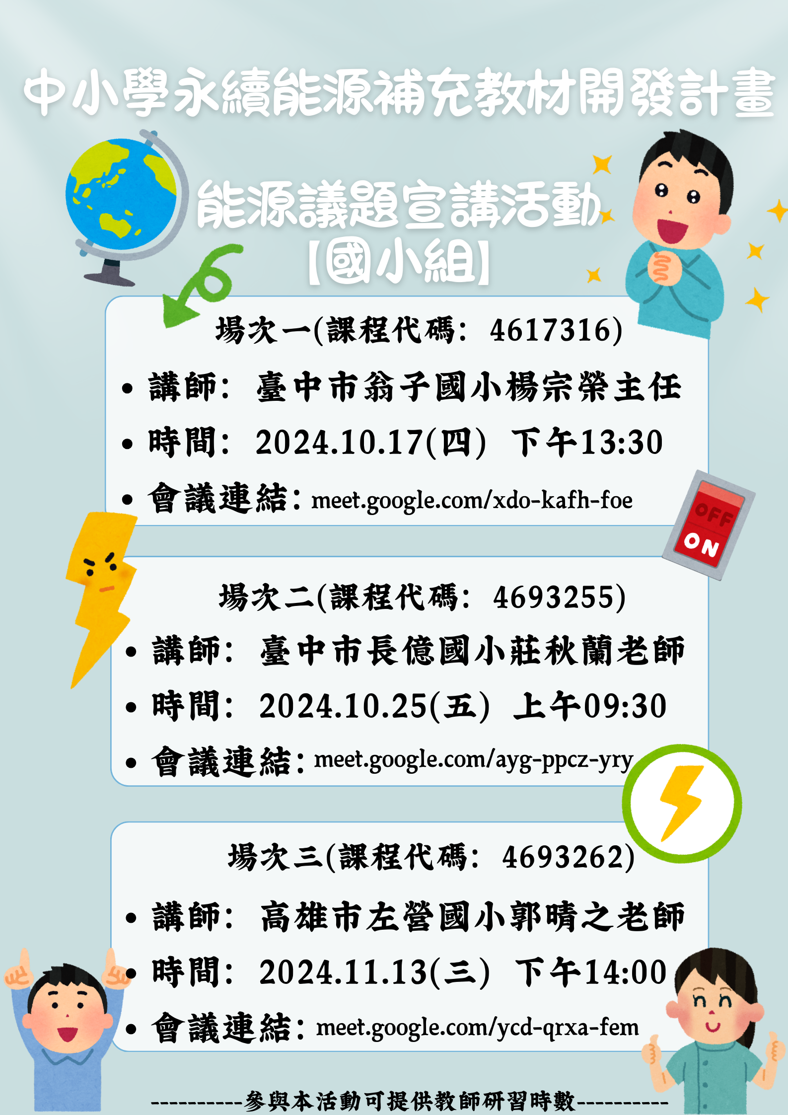 一、依據國立高雄師範大學113年10月11日高師大工教字第 1131008868號函辦理。 二、旨揭活動講師、時間及日期說明如下: (一)【國小組】場次一(課程代碼:4617316);講師:臺中 市翁子國小楊宗榮主任;時間:113年10月17日(星期 四)下午1時30分至3時;Google Meet連結:meet. google.com/xdo-kafh-foe。 (二)【國小組】場次二(課程代碼:4693255);講師:臺中 市長億國小莊秋蘭老師;時間:113年10月25日(星期 五)上午9時30分至11時0分;Google Meet連結:meet.google.com/ayg-ppcz-yry。 (三)【國小組】場次三(課程代碼:4693262);講師:高雄 市左營國小郭晴之老師;時間:113年11月13日(星期 三)下午2時至3時30分;Google Meet連結:meet. google.com/ycd-qrxa-fem。 (四)【國中組】場次一(課程代碼:4693273);講師:臺南 市安南國中余曉綺老師;時間:113年10月29日(星期 二)上午10時0分至11時30分;Google Meet連結:meet. google.com/erz-nkty-wxk。 (五)【國中組】場次二(課程代碼:4693280);講師:臺中 市潭子國中梁瑞秢老師;時間:113年10月31日(星期 四)下午2時0分至3時30分;Google Meet連結:meet. google.com/rpx-zyjc-syg。 (六)【國中組】場次三(課程代碼:4693286);講師:高雄 市大樹國中郭政源主任;時間:113年11月14日(星期 四)上午10時0分至11時30分;Google Meet連結:meet. google.com/nho-pvnv-fup。 三、全程參與課程將核發研習時數2小時;未全程參與者,將不 核予研發時數。